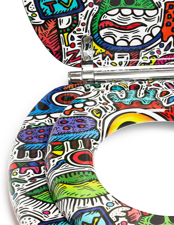 Entdecken Sie den Toilettensitz Crazy Maniac für Kinder - designt von dem talentierten Künstler Skwak, dessen Werke weltweit ausgestellt werden. Ein unentbehrliches Accessoire, um Ihre Kinder bei diesem wichtigen Schritt, dem Gang zur Toilette, zu unterstützen. Ein spielerisch bunter Kindersitz – entworfen als Kunstobjekt für Eltern und als lustige Erfahrung für Kinder, die von diesem Design bestimmt begeistert sofort sein werden.