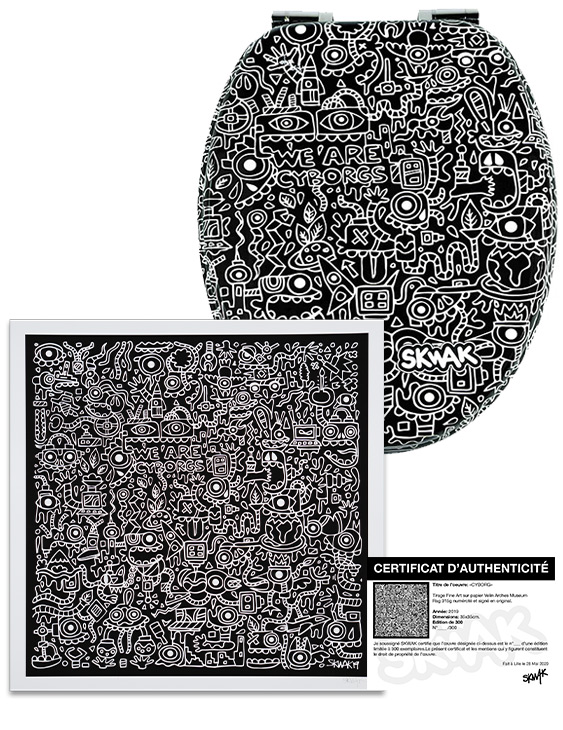 Seit seiner Jugend erdachte sich der aus France stammende Illustrator Skwak die "Maniac World", ein kreatives, detailreiches, verrücktes und dichtes farbenfrohes Universum, ein wahres Gegenstück zu Trübsinn und Verdrossenheit. Seine Werke stellt er auf der ganzen Welt aus, von Paris bis Los Angeles über Shanghai und zeichnet wie von selbst, um das Alltägliche bis zur Absurdität aufzuarbeiten. Das schwarz-weiße Modell "Cyborg", eine Reproduktion des Originalwerks "Maniac Cyborg".