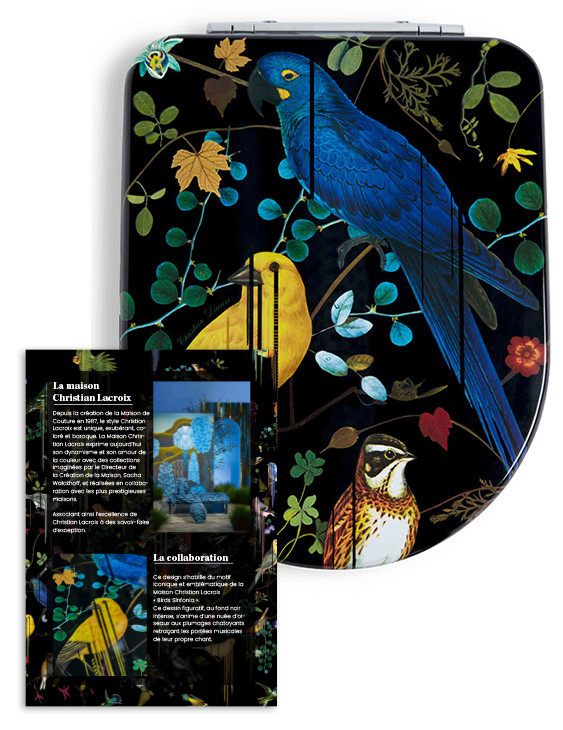 La Maison Christian Lacroix s’associe à la marque TohaaDesign pour vous proposer un modèle d'abattant WC unique, exubérant et coloré. Cet abattant design s’habille du motif iconique et emblématique de la Maison Christian Lacroix "Birds Sinfonia". Ce dessin figuratif, au fond noir intense, s’anime d’une nuée d’oiseaux aux plumages chatoyants retraçant les portées musicales de leur propre chant. Une touche d'audace, de créativité et de prestige.