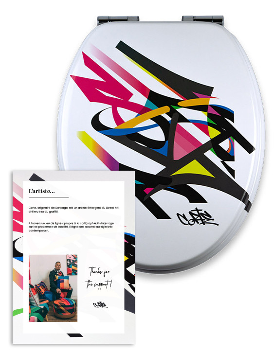 Cette lunette de WC chic et design signée Camilo Ortega F. donne une touche street art élégante à vos toilettes. Artiste Chilien émergent, Camilo Ortega F. alias Corte fait sortir le street art et réinvente le petit coin ! Avec "Saray03" pour TohaaDesign, du nom d'une ville turque de la région de Marmara, il intègre son art audacieux et coloré à votre quotidien.