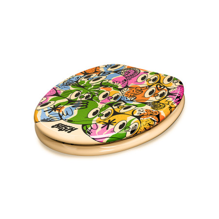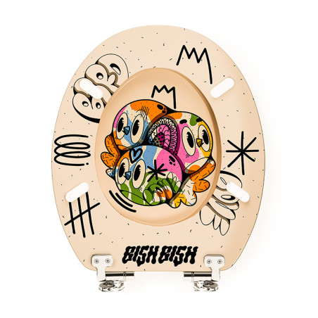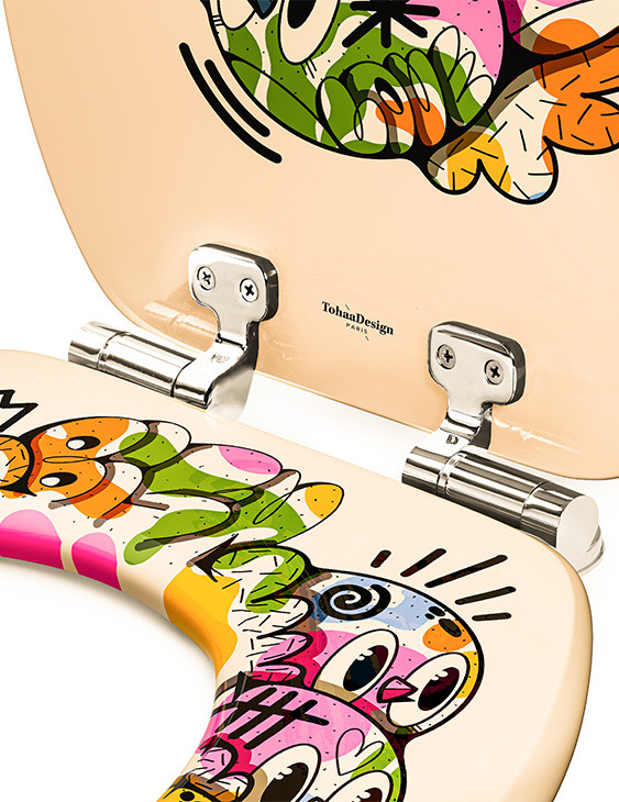 L’abattant WC Color Bomb, deuxième modèle exclusif signé par l’artiste Bishop Parigo pour TohaaDesign, explose de couleurs avec son fond pastel délicat et ses oiseaux flashy pleins d’énergie. Le contraste entre les teintes douces et les touches vives crée un visuel graphique fort et immédiatement reconnaissable. Une création originale qui apporte une touche artistique et inattendue à l’univers de la salle de bain.