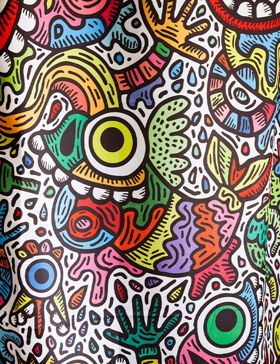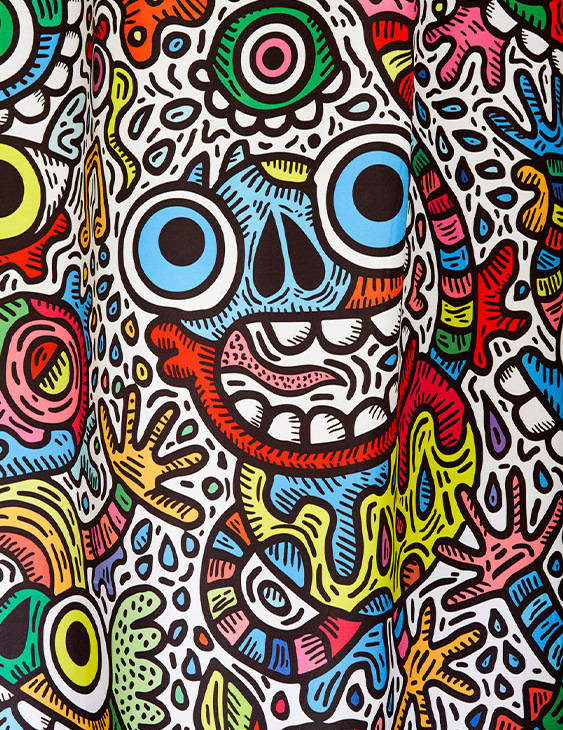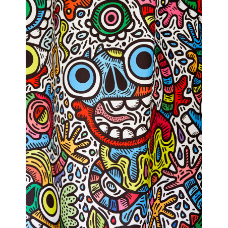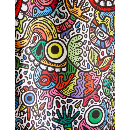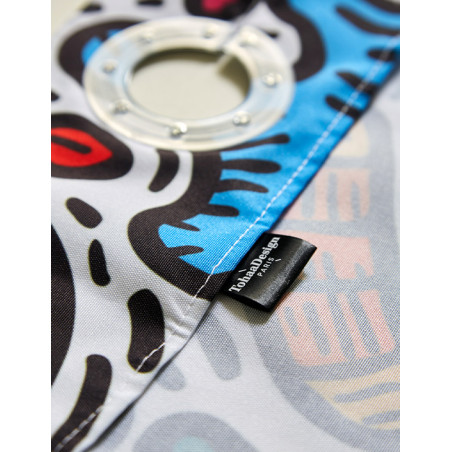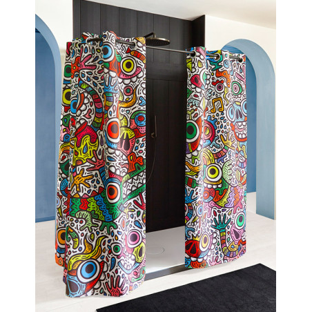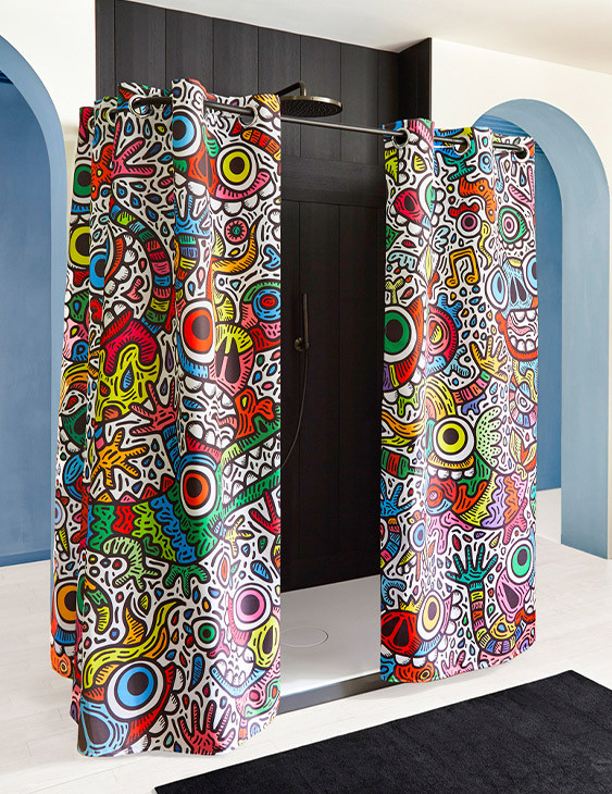 Réalisé exclusivement pour TohaaDesign, ce rideau de douche "Maniac Party" au design mouvementé et haut en couleurs est signé SKWAK, artiste français à l’univers foisonnant. Griffé par l’artiste, ce modèle est une pièce rare, qui distinguera votre salle de bains à coup sûr.