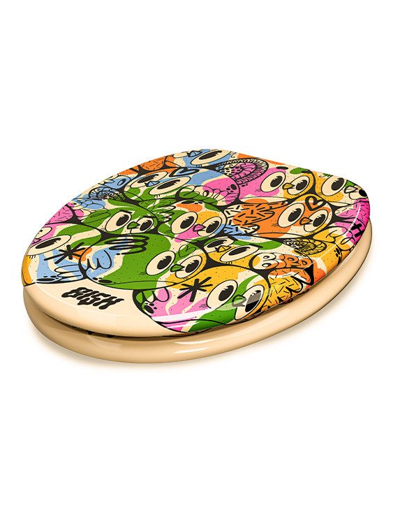 L’asse WC Color Bomb, secondo modello esclusivo firmato dall’artista Bishop Parigo per TohaaDesign, esplode di colori grazie al suo fondo pastello delicato e ai suoi uccelli flashy pieni di energia. Il contrasto tra le tonalità morbide e gli accenti vivaci crea un design grafico forte e immediatamente riconoscibile. Un asse per toilette originale che dona un tocco artistico e inaspettato all’ambiente bagno.
